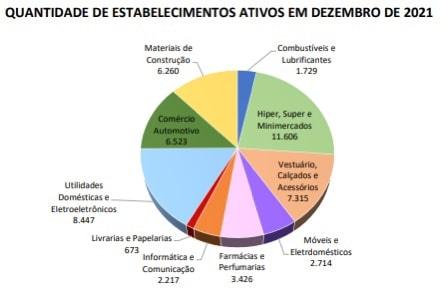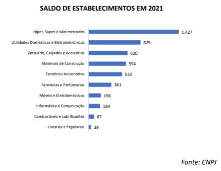 A pesquisa, que exclui os Microempreendedores Individuais (MEIs), revelou que o segmento de hiper, super e minimercados apresentou o maior saldo no ano, com 1.427 estabelecimentos abertos no período, o que representa 29,3% do total. Em seguida, vem o segmento de utilidades domésticas e eletroeletrônicos, com 825 CNPJs ativos (16,9%). Vestuário, calçados e acessórios fecharam em terceiro (12.7%), com 620 novos empreendimentos.