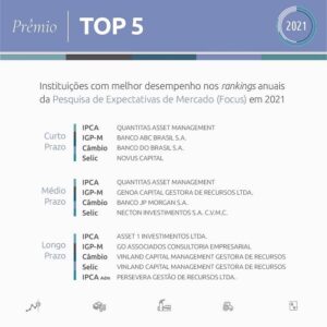 O Prêmio Top 5 é entregue às instituições que obtiveram o primeiro lugar nos rankings anuais de curto, médio e longo prazos para cada um dos indicadores para os quais o ranking foi calculado: IPCA, IGP-M, Taxa de Câmbio, meta para a Taxa Selic e Preços Administrados.