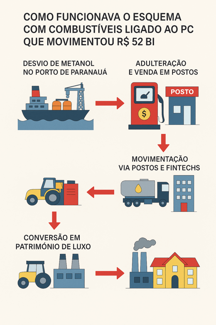 Entre 2020 e 2024, pelo menos 1.000 postos de combustíveis vinculados ao esquema movimentaram cerca de R$ 52 bilhões, segundo a Receita Federal. Essa rede funcionava como porta de entrada para legalizar recursos de origem ilícita. Para dar aparência de normalidade às transações, os criminosos usavam empresas de fachada, notas fiscais frias e intermediários, mascarando o controle real exercido pelo PCC sobre o negócio.
